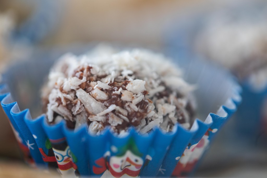 Image decription: Chocolate truffle with coconut coating in a blue mini muffin cup with cartoonish figures of a snow person, a penguin in a scarf and glasses, and Santa on it. Photo by Tracy Isaacs
