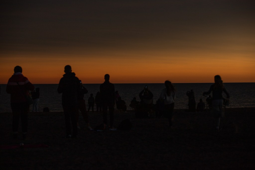 After lunch at Mackie’s we grabbed our chairs and gear (eclipse glasses, some blankets and towels to keep warm, drinks) and set ourselves up on the beach with a thousand-ish other people. We got there right around the time the partial eclipse was starting. Of course you could only tell with the glasses on. Within about half an hour of totality it started to get visibly darker and the temperature began to drop. It was already quite cool on the beach, but the darkness made a big difference.