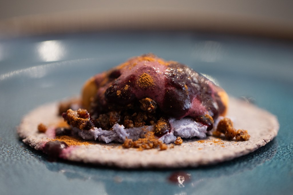 Third course: Purple — blue corn, blueberry, basil, cinnamon, hazelnut, butterfly creme. I’m not a food critic and I don’t have a talent for describing what is going on flavour-wise. But the blue course definitely presented the most interesting and unexpected flavour combinations. The blue corn was in the form of a soft tortilla, topped with the other ingredients. We were instructed to fold it in half like a taco and eat it with our hands. What an original and delicious dessert it was. Not overly sweet (indeed, nothing on the menu is too sweet, and Serge notes on his website that “sugar is used sparingly so the natural flavour comes first.”