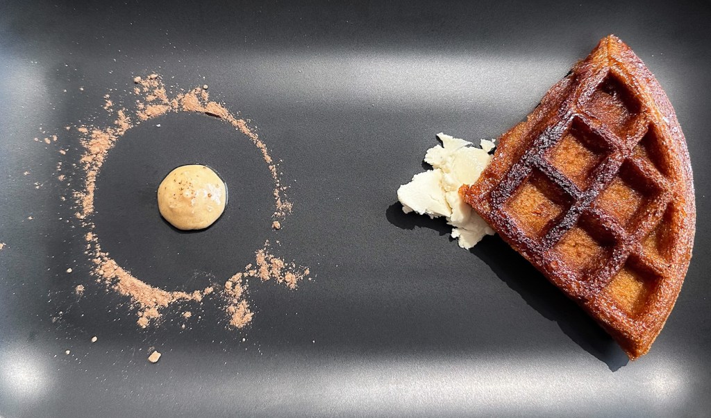 Fourth course: Gold — waffle, dark maple syrup, Nuts for Cheese cream cheese, Nuts for Cheese butter, smoked sea salt, Honduras Copan cacao. If there was a “main course,” the taco and this might be competing for that spot. Serge has a great Instagram post about how he makes this waffle, cooking syrup right into it. It works. The cream cheese and butter cut the sweetness just the right amount.