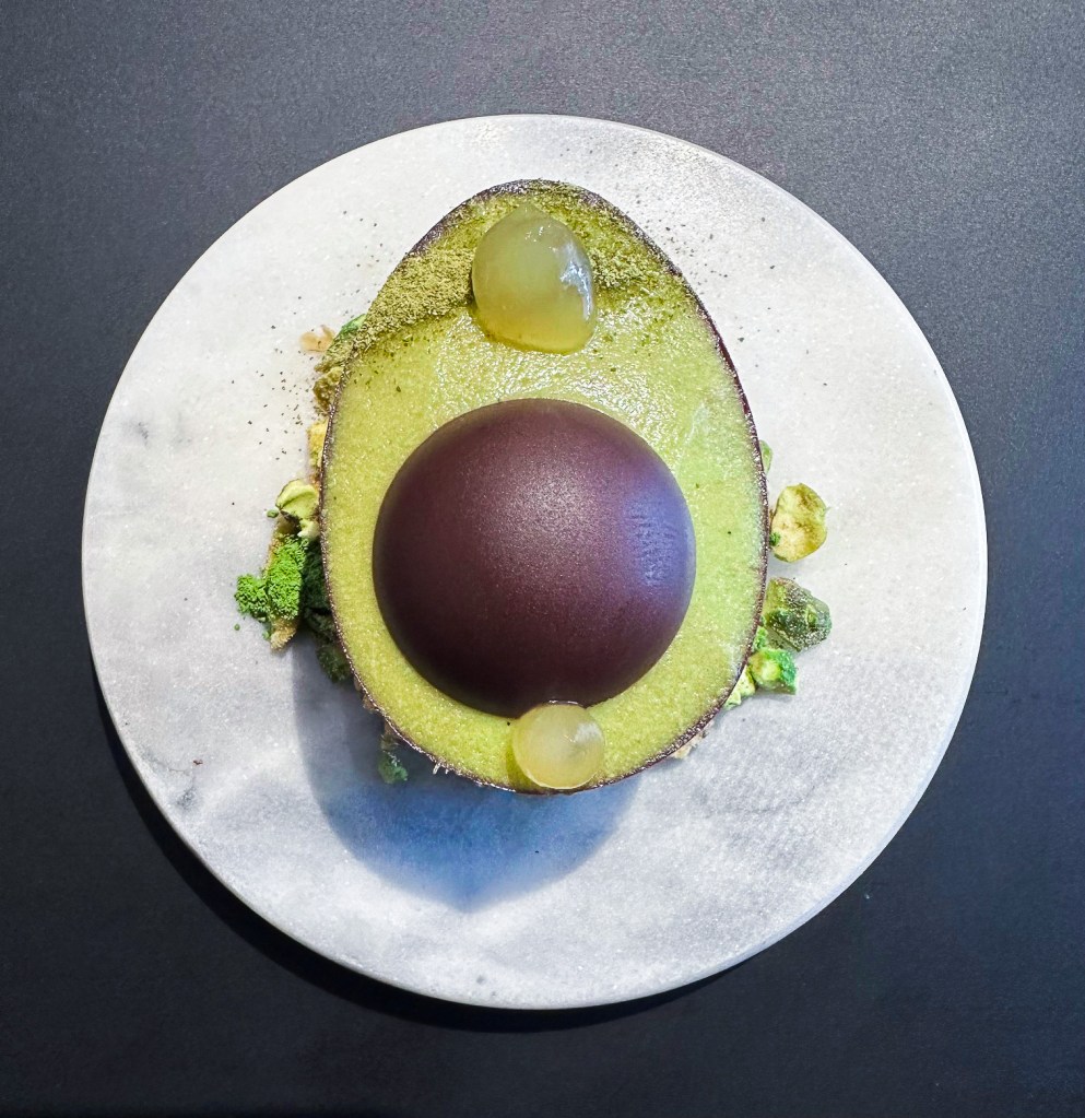 Second course: Green — avocado, makrut lime, hazelnut, cacao, pistachio, matcha, yuzu. This one had, to me, the most visual impact. It was designed to mimic a halved avocado in appearance, with a chocolate shell standing in for the skin and a small domed chocolate standing in for the pit. He placed it on a base of chopped pistachios for added taste and texture. The filling was creamy as velvet.