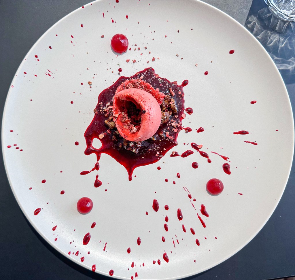Fifth and final course: Red — sour cherry, almond, panela, malwena strawberry, hibiscus, sudachi. This one was the hardest to photograph because all of my versions came out looking like a blood-spattered plate. After the taco and waffle, this was a light ending full of flavour. The hibiscus added a fragrant element and the strawberry tasted intensely fresh.