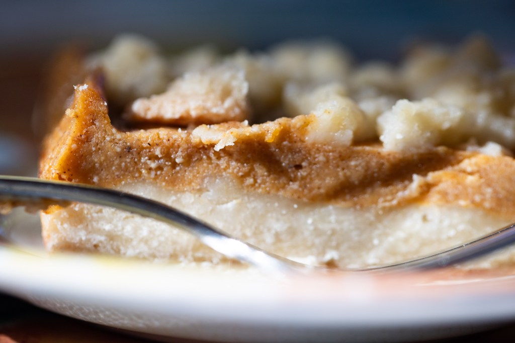 Image description: Close-up shot of the side of a pumpkin crumble bar on a plate with a fork alongside. Photo by Tracy Isaacs